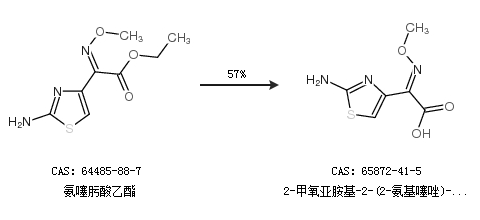 1.通过氨噻肟酸乙酯合成2-甲氧亚胺基-2-(2-氨基噻唑)-4-乙酸,收率约57%;