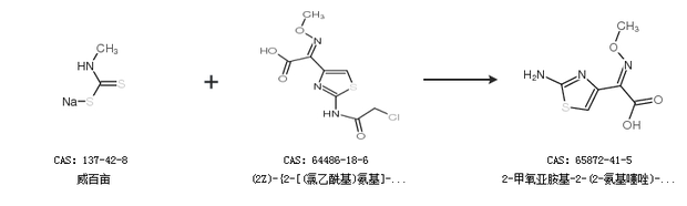2.通过威百亩和(2Z)-{2-[(氯乙酰基)氨基]-1,3-噻唑-4-基}(甲氧基亚氨基)乙酸合成2-甲氧亚胺基-2-(2-氨基噻唑)-4-乙酸