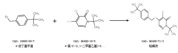 1.通过对叔丁基氯苄和4-氯-2-(1,1-二甲基乙基)-5-疏基-3(2H)-吡嗪酮合成哒螨灵,收率约85%;