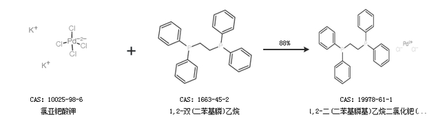 1.通过氯亚钯酸钾和1,2-双(二苯基膦)乙烷合成1,2-二(二苯基膦基)乙烷二氯化钯(II),收率约88%;