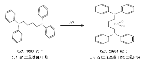 2.通过1,4-双(二苯基膦)丁烷合成1,4-双(二苯基膦丁烷)二氯化钯,收率约89%;