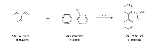2.通过三甲氧基硼烷和2-溴联苯合成2-联苯硼酸,收率约81%;