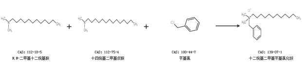 1.通过N,N-二甲基十二烷基胺、十四烷基二甲基叔胺和苄基氯合成十二烷基二甲基苄基氯化铵