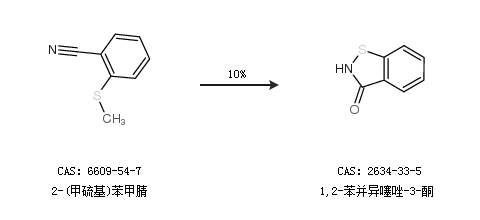 2.通过2-(甲硫基)苯甲腈合成1,2-苯并异噻唑-3-酮,收率约10%;