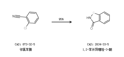1.通过邻氯苯腈合成1,2-苯并异噻唑-3-酮,收率约95%;