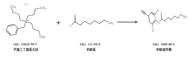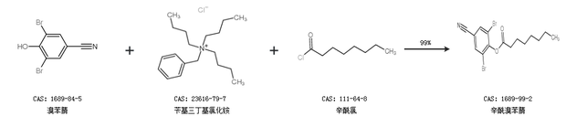 1.通过溴苯腈、苄基三丁基氯化铵和辛酰氯合成辛酰溴苯腈,收率约99%;