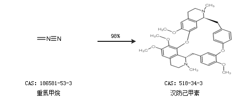 1.通过重氮甲烷合成汉防己甲素,收率约98%;