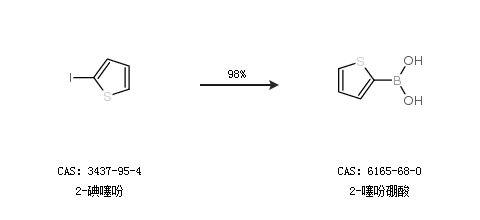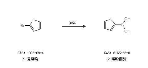 用作合成中间体,2-噻吩基硼酸分子中引入了噻吩基团成为了非常有用的试剂。在Suzuki-Miyaura偶联反应中,加入钯催化剂,2-噻吩基硼酸与5-溴嘧啶衍生物反应得到63%的5-(2-噻吩) 嘧啶衍生物。