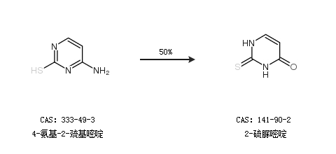 1.通过4-氨基-2-巯基嘧啶合成2-硫脲嘧啶,收率约50%;