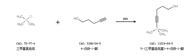 1.通过三甲基氯硅烷和4-戊炔-1-醇合成5-(三甲基硅烷基)-4-戊炔-1-醇,收率约99%;
