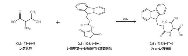 1.通过L-苏氨酸和9-芴甲基-N-琥珀酰亚胺基碳酸酯合成Fmoc-L-苏氨酸,收率约99%;
