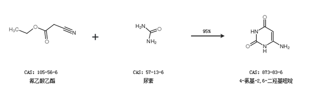 1.通过氰乙酸乙酯和尿素合成4-氨基-2,6-二羟基嘧啶,收率约95%;