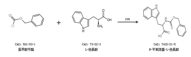 1.通过氯甲酸苄酯和L-色氨酸合成N-苄氧羰基-L-色氨酸,收率约10%;