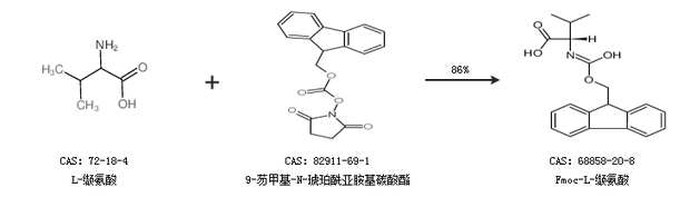 2.通过L-缬氨酸和9-芴甲基-N-琥珀酰亚胺基碳酸酯合成Fmoc-L-缬氨酸,收率约86%;