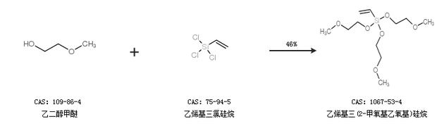 1.通过乙二醇甲醚和乙烯基三氯硅烷合成乙烯基三(2-甲氧基乙氧基)硅烷,收率约46%;
