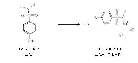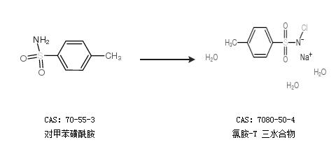 中文别名 氯胺T钠;氯胺T三水合物;氯胺T,三水合物;三水合氯铵-T;对甲苯磺酰氯胺钠三水合物;对甲苯;