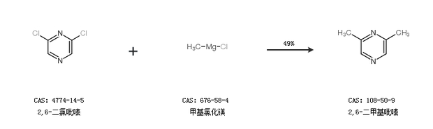 1.通过2,6-二氯吡嗪和甲基氯化镁合成2,6-二甲基吡嗪,收率约49%;
