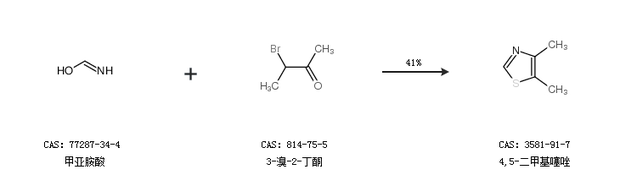 1.通过甲亚胺酸和3-溴-2-丁酮合成4,5-二甲基噻唑,收率约41%;
