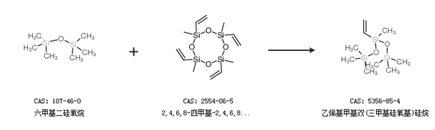 2.通过六甲基二硅氧烷和2,4,6,8-四甲基-2,4,6,8-四乙烯基环四硅氧烷合成乙烯基甲基双(三甲基硅氧基)硅烷