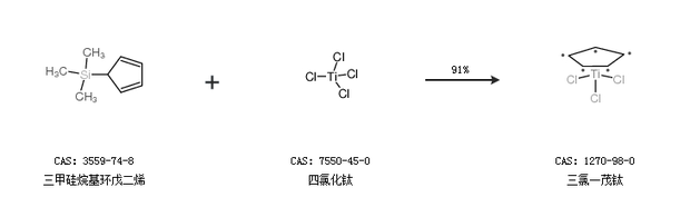 2.通过三甲硅烷基环戊二烯和四氯化钛合成三氯一茂钛,收率约91%;