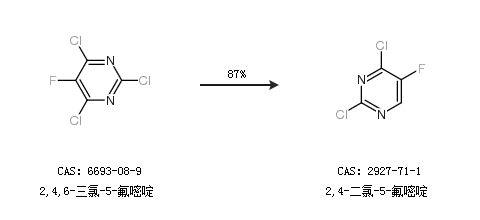 2.通过2,4,6-三氯-5-氟嘧啶合成2,4-二氯-5-氟嘧啶,收率约87%;