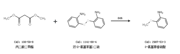 2.通过丙二酸二甲酯和双(2-氨基苯基)二硫合成2-氨基茴香硫醚,收率约84%;