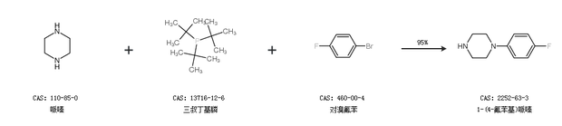 1.通过哌嗪、三叔丁基膦和对溴氟苯合成1-(4-氟苯基)哌嗪,收率约95%;