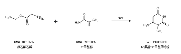 2.通过氰乙酸和N-甲基脲合成6-氨基-1-甲基尿嘧啶,收率约69%;