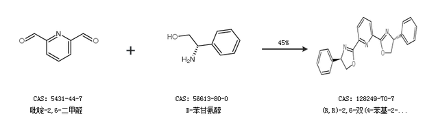 2.通过吡啶-2,6-二甲醛和D-苯甘氨醇合成(R,R)-2,6-双(4-苯基-2-恶唑啉-2-基)吡啶,收率约45%;