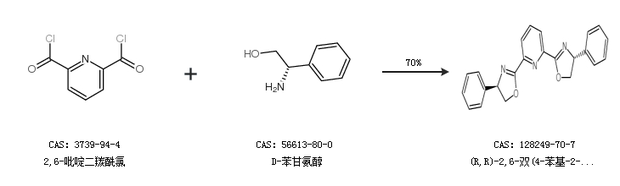 1.通过2,6-吡啶二羰酰氯和D-苯甘氨醇合成(R,R)-2,6-双(4-苯基-2-恶唑啉-2-基)吡啶,收率约70%;