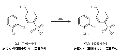 2.通过2-氯-1-甲基吡啶鎓对甲苯磺酸盐合成2-氟-1-甲基吡啶翁对甲苯磺酸盐,收率约90%;