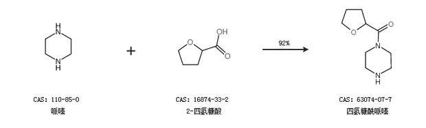 1.通过哌嗪和2-四氢糠酸合成四氢糠酰哌嗪,收率约92%;