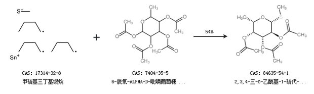 2.通过甲硫基三丁基锡烷和6-脱氧-ALPHA-D-吡喃葡萄糖 1,2,3,4-四乙酸酯合成2,3,4-三-O-乙酰基-1-硫代-β-L-岩藻糖苷甲酯,收率约54%;