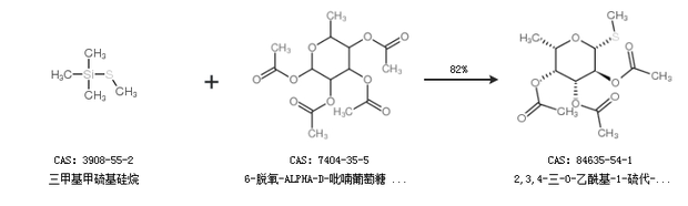 1.通过三甲基甲硫基硅烷和6-脱氧-ALPHA-D-吡喃葡萄糖 1,2,3,4-四乙酸酯合成2,3,4-三-O-乙酰基-1-硫代-β-L-岩藻糖苷甲酯,收率约82%;