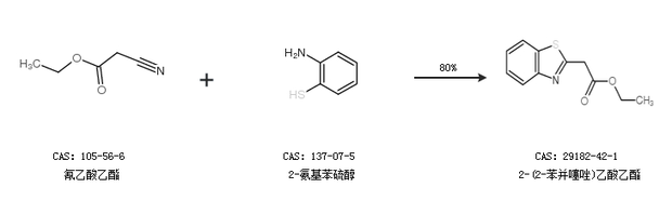 1.通过氰乙酸乙酯和2-氨基苯硫醇合成2-(2-苯并噻唑)乙酸乙酯,收率约80%;