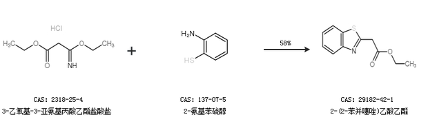 2.通过3-乙氧基-3-亚氨基丙酸乙酯盐酸盐和2-氨基苯硫醇合成2-(2-苯并噻唑)乙酸乙酯,收率约58%;