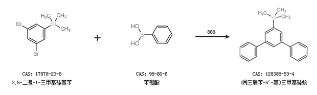 1.通过3,5-二溴-1-三甲基硅基苯和苯硼酸合成(间三联苯-5''-基)三甲基硅烷,收率约86%;