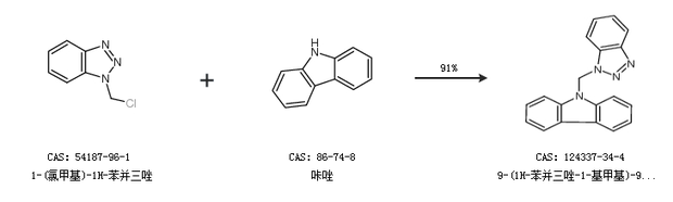 1.通过1-(氯甲基)-1H-苯并三唑和咔唑合成9-(1H-苯并三唑-1-基甲基)-9H-咔唑,收率约91%;