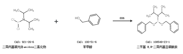 1.通过二异丙基磷光体amidous二氯化物和苯甲醇合成二苄基 N,N-二异丙基亚磷酰胺,收率约89%;