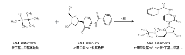 2.通过叔丁基二甲基氯硅烷和N-苯甲酰-2''-脱氧胞苷合成N-苯甲酰基-5’-O-叔-丁基二甲基甲硅烷-2’-脱氧胞啶,收率约49%;