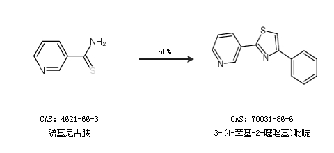 1.通过巯基尼古胺合成3-(4-苯基-2-噻唑基)吡啶,收率约68%;