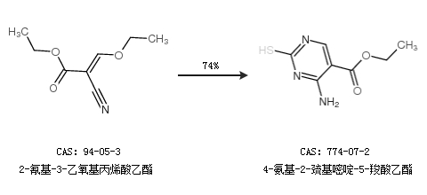 1.通过2-氰基-3-乙氧基丙烯酸乙酯合成4-氨基-2-巯基嘧啶-5-羧酸乙酯,收率约74%;
