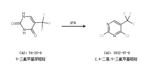 1.通过5-三氟甲基尿嘧啶合成2,4-二氯-5-三氟甲基嘧啶,收率约97%;