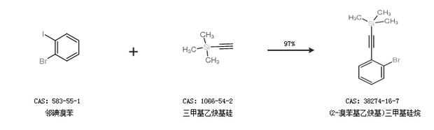 1.通过邻碘溴苯和三甲基乙炔基硅合成(2-溴苯基乙炔基)三甲基硅烷,收率约97%;