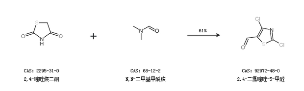 1.通过2,4-噻唑烷二酮和N,N-二甲基甲酰胺合成2,4-二氯噻唑-5-甲醛,收率约61%;