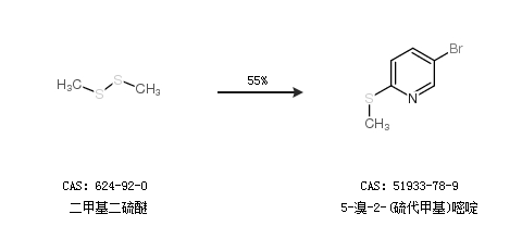 2.通过二甲基二硫醚合成5-溴-2-(硫代甲基)嘧啶,收率约55%;
