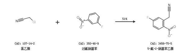 1.通过氯乙腈和对氟硝基苯合成5-氟-2-硝基苯乙腈,收率约51%;