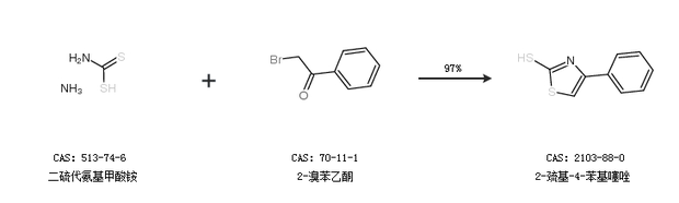 1.通过二硫代氨基甲酸铵和2-溴苯乙酮合成2-巯基-4-苯基噻唑,收率约97%;