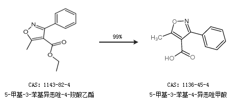 2.通过5-甲基-3-苯基异恶唑-4-羧酸乙酯合成5-甲基-3-苯基-4-异恶唑甲酸,收率约99%;