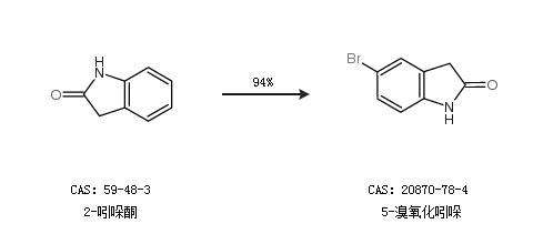 1.通过2-吲哚酮合成5-溴氧化吲哚,收率约94%;